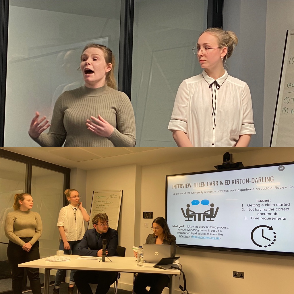 The second Kent team took on the nightmare that is judicial review via a challenge set by the Public Law Project. The PLP wanted to the team to create an accessible explainer for people who are going through the judicial review process, some of whom may be doing so without much or any legal support. This was quite a tough ask and the team did well to show their understanding of the context of use, as well as using the touch points to inform their presentation format. Helpful for us all to see the forms used and the team’s ideas around streamlining and simplification.