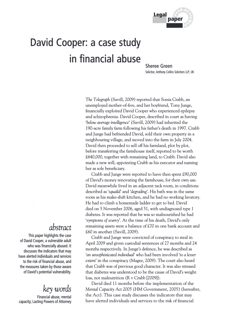 It made me wonder about the role of many people who had contact with David during this period, including a number of solicitors. I had the opportunity of exploring how we might use the law to intervene or prevent these dreadful circumstances arising, which in turn let me to seek involvement in the Law Society Mental Health and Disability Committee as a means of raising awareness of financial and other abuse and equipping solicitors to play their role in the safeguarding process. (Ed. note: have a read of Sheree’s paper David Cooper: a case study in financial abuse)