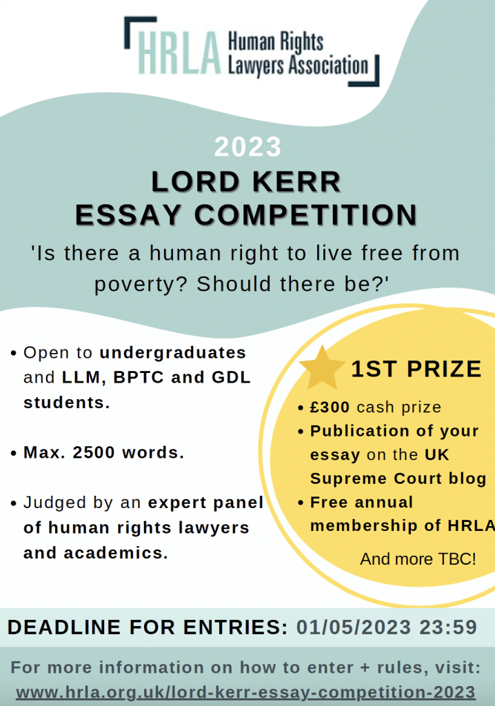 A reminder that The Human Rights Lawyers Association’s (HRLA) Young Lawyers’ Committee (YLC) announced the launch of the Lord Kerr Essay Competition 2023 a little while ago. You have until the 1st May to get this done!