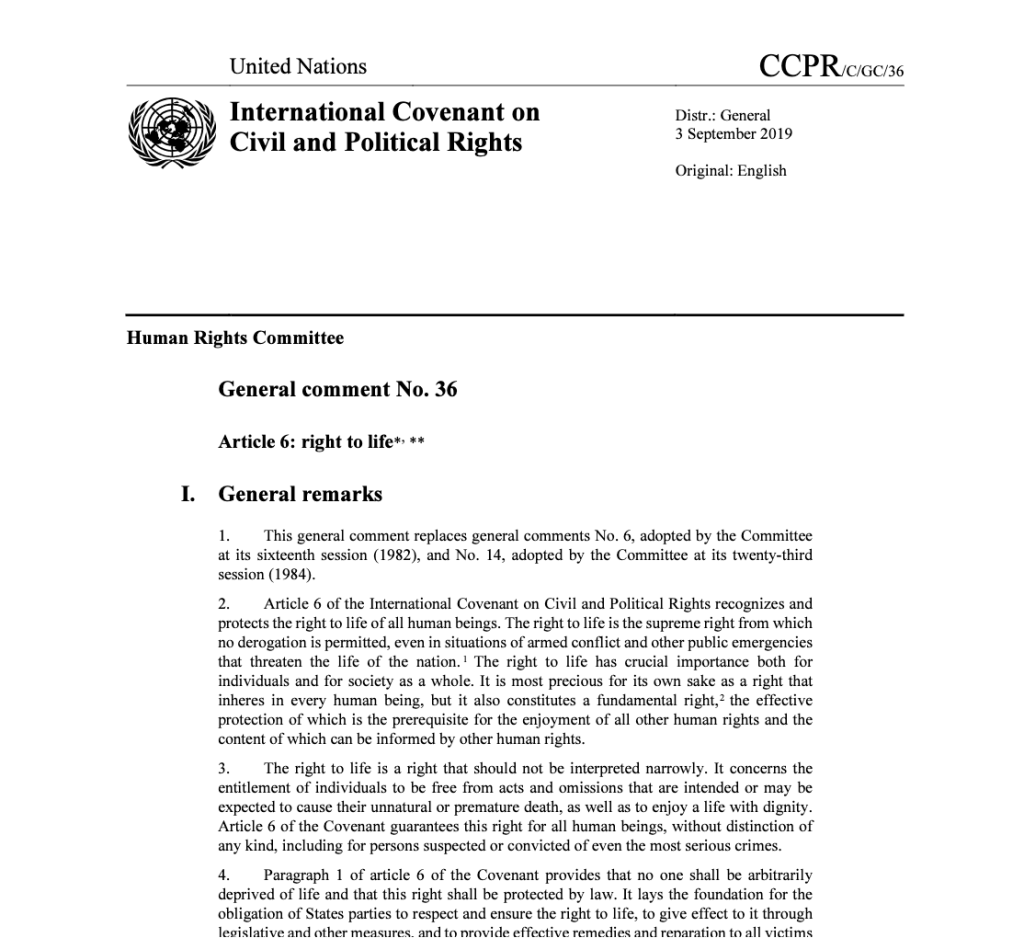 While much was questioned, discussed and contended during this Monday evening lecture, I would like to draw your attention to the United Nations General Comment no. 36, Article 6 (Right to Life), which Professor Shany helped create. Each treaty body of the United Nations publishes interpretations of its articles and provisions in the form of a ‘general comment.’ These general comments are often written by bodies of experts and this comment, in particular, was authored by a diverse group of state actors and individuals from civil society. General Comment no. 36 was published in 2019 by the UN Human Rights Committee (HRC), the body created by the UN to interpret and oversee the implementation of the 1966 International Covenant on Civil and Political Rights (ICCPR). Article 6 of the ICCPR focuses primarily on the ‘right to life’ and limitations which may be placed on that right.