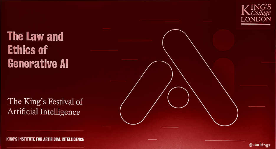 I’ll begin this write-up with full disclosure. I am rather concerned about the latest advancements in generative AI technology and the lacklustre regulatory developments which trudge slowly behind. But as the old proverb says keep your friends close, and your enemies closer so I sought to educate myself further on the anxiety-inducing matter. As it happens, late May marks a celebratory time for the King’s Institute for Artificial Intelligence as it holds a week-long festival, and complementary month-long showcase celebrating the technology. One of the many speakers being hosted by the festival was Professor Dan Hunter, Executive Dean of the Dickson Poon School of Law at King’s College London. Hunter has been researching AI law for more than thirty years, ‘long before it was sexy.’ A charismatic and personable orator, Hunter made it clear that he is the founder of multiple generative AI startups. So while his take on the ethical concerns mounting against generative AI was humourous and charming, it was also incredibly biased. In the end however, even he repeatedly expressed deep concern and fear, making it clear that ‘we’re in a lot of trouble.’