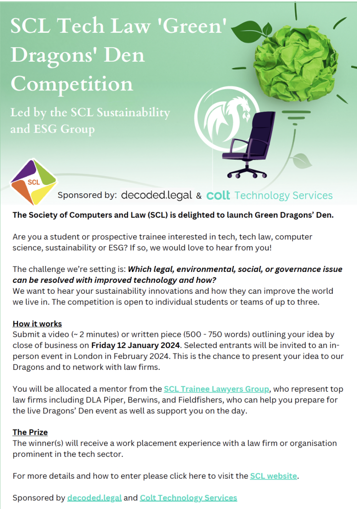 There is also the Green Dragons Den Competition. Organised by the The SCL Sustainability and ESG Group, this is for those interested in how law can embrace sustainability principles. If you have a good idea, you need to submit a video or a written piece by 12 January 2024. Selected entrants will then be invited to present their idea at an in-person event in London.
