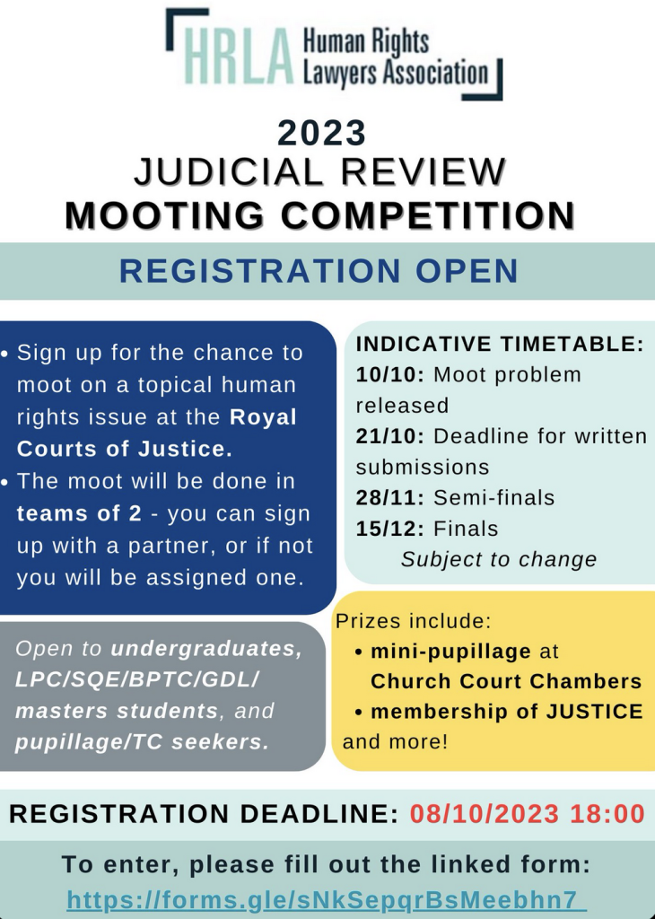 This is a fantastic opportunity from the Human Rights Lawyers Association (Young Lawyers Committee) to develop and improve legal reasoning and advocacy skills, as well as the chance to argue your case at the Royal Courts of Justice for the final in December.