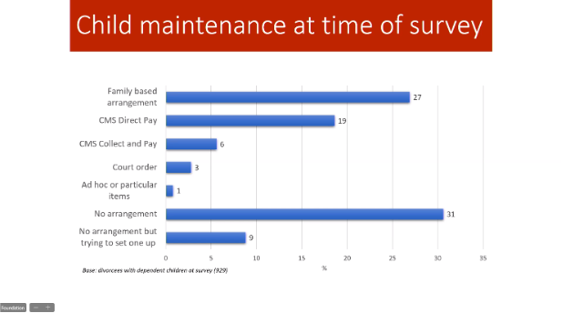 Of the divorced parents in the study, a sizable minority (39%) either did not have a child maintenance agreement or were still in the process of establishing one. The main reason offered by parents for not making arrangements was that since they shared childcare, expenses were distributed amongst the involved parties. Child maintenance arrangements were made alongside the divorce process for most divorcing parents. Financially better-off individuals were more likely to have an arrangement than less well-off individuals. When their children reached adulthood and were no longer dependents, 84% of divorced parents continued to provide financial support for them.