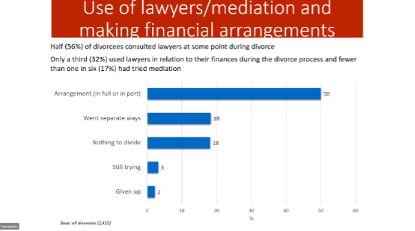 Around half of all divorcing couples sought legal advice at some time during the process and around a third (32%) had consulted lawyers regarding their financial matters during the divorce process. Fewer than one in six (17%) had attempted the use of mediation.