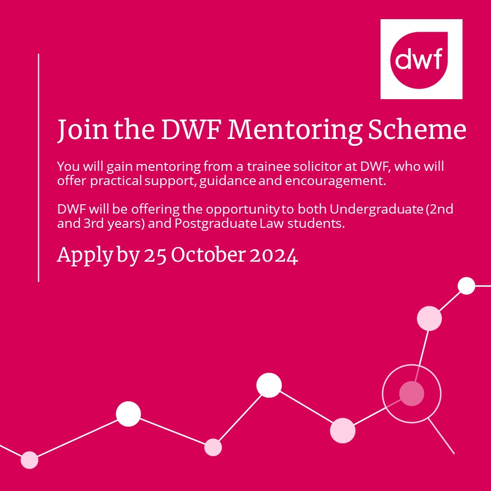 As we did last year, the Student Experience Team have teamed up with DWF to run a mentoring scheme. The Mentoring Scheme will provide you with access to a trainee solicitor, who will offer practical support, guidance, and encouragement. There will also be in person and virtual events providing great opportunities to network and find out more about DWF. The scheme is ideally suited for both Undergraduate (2nd and 3rd year) and Postgraduate Law students.