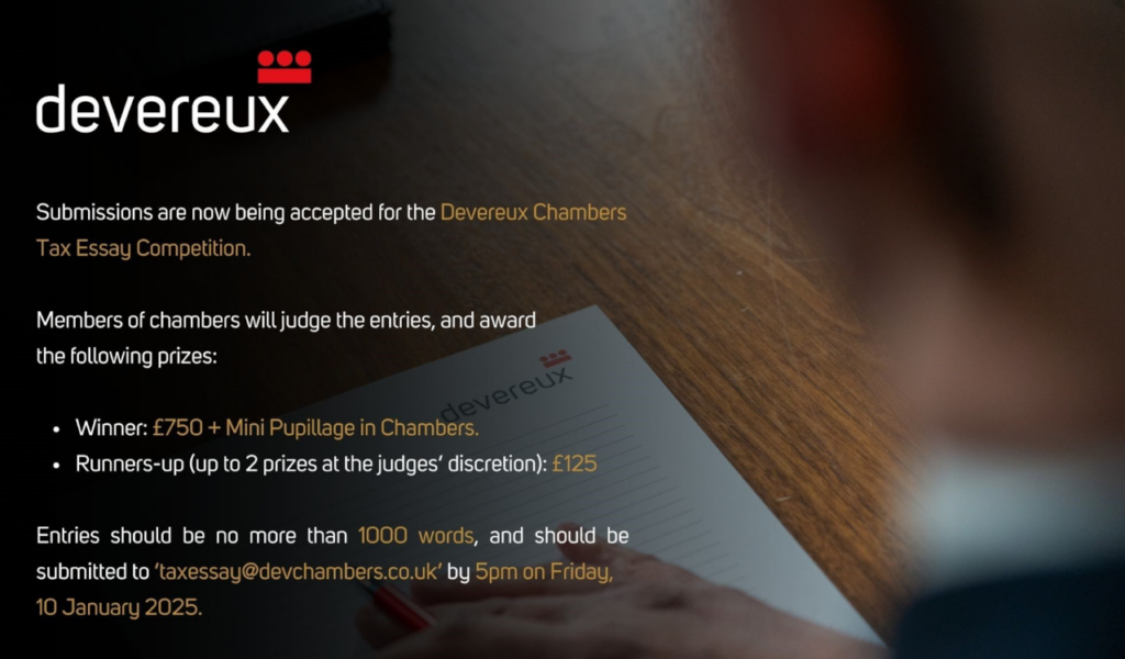 Devereux Chambers has launched its Tax Essay Writing Competition. The good news is that no previous knowledge of tax law is required, and there is no prescribed format for entries.