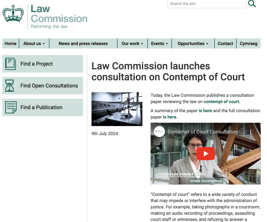 The Law Commission’s public consultation period for the reforms to Contempt of Court closes on the 29th November 2024. You can also find versions of the report on the Ministry of Justice’s webpage for the project. There you can find details on how to contribute to the discussion.