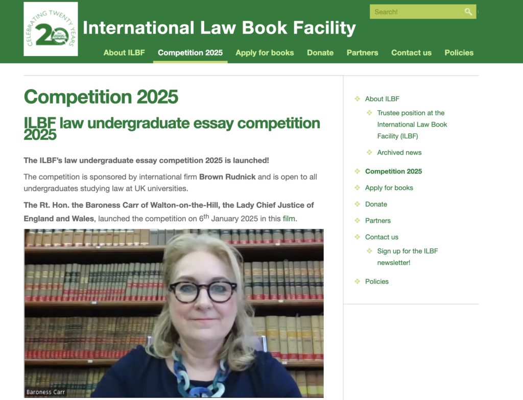 Baroness Carr, Lady Chief Justice of England and Wales, has launched the International Law Book Facility’s (ILBF) 2025 essay competition – open to all undergraduates studying law in the UK. You can watch her introducing the competition via YouTube.