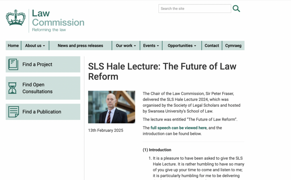 Sir Peter Fraser delivered the Society of Legal Scholars (SLS) Hale Lecture on the 6th February 2025 at the University of Swansea. He took up his position as Chair of the Law Commission of England and Wales in June 2023.