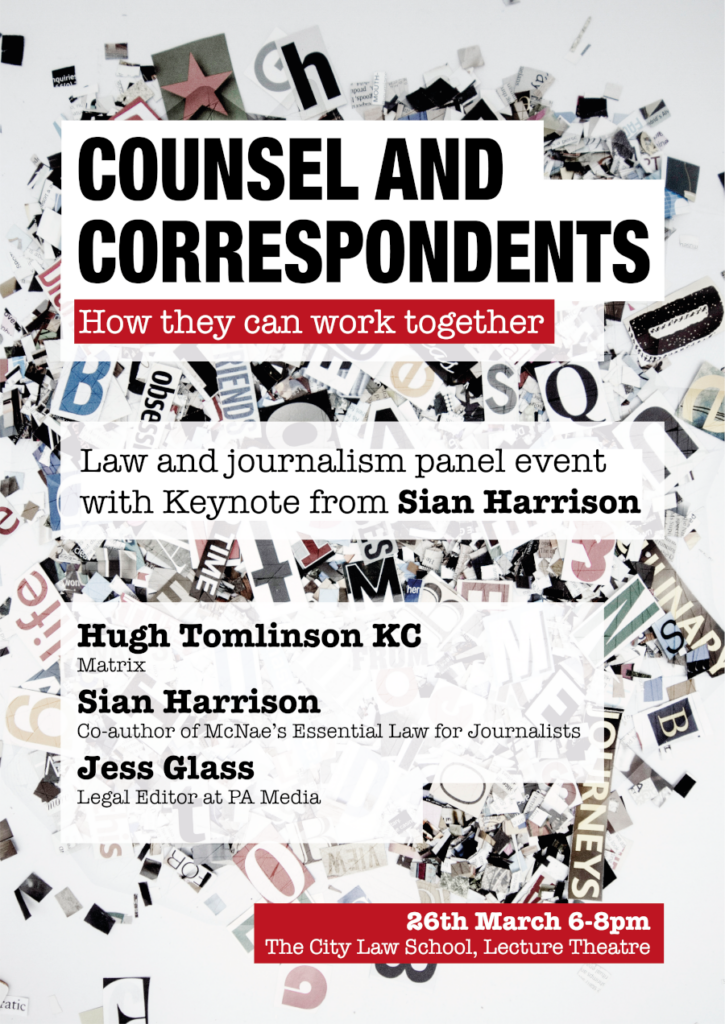 If you’re interested in learning how lawyers and journalists interact, or why so few cases ever make it to being reported then come along to this event tomorrow – Wednesday 26th March. Full details in flyer below but likely to be of interest to lawyers and journalists.