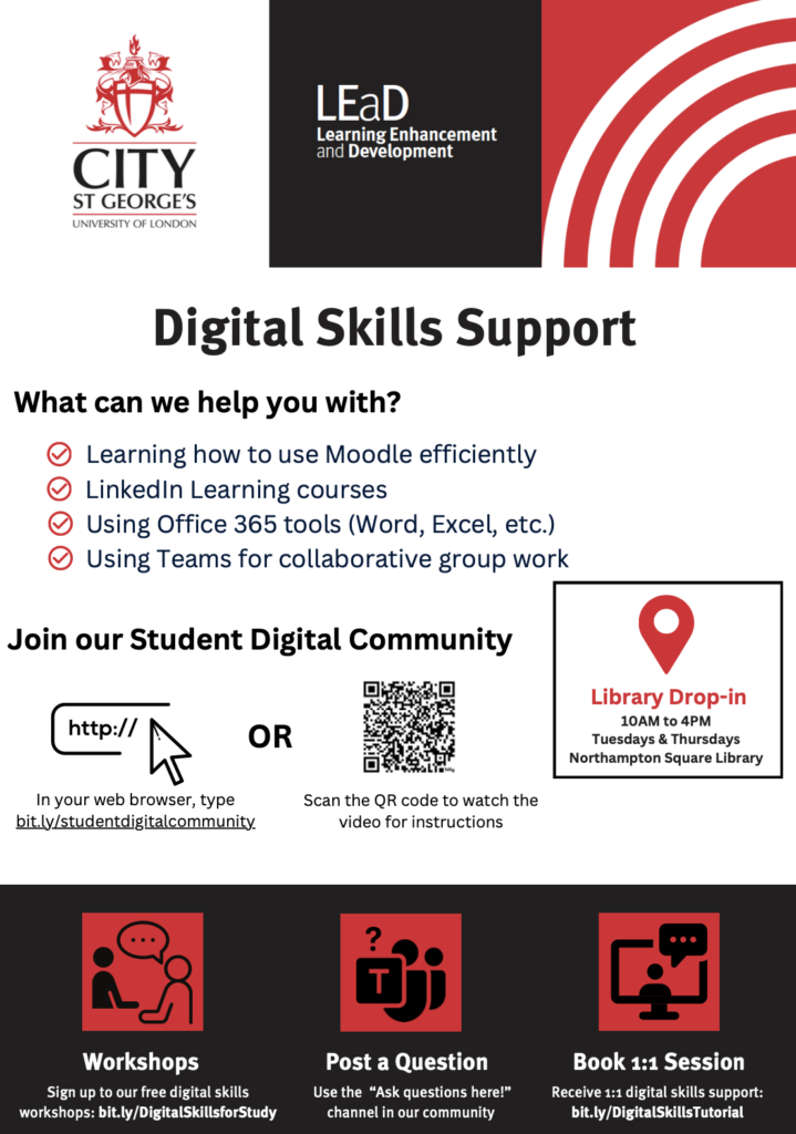 Danon Pritchard (Director of Digital Literacies in CLS) would like to remind you all about the brilliant central support that is available at City St George’s to help you with digital skills – developing these skills can help with your learning but also build your readiness for your future career.
